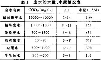 仿真絲滌綸布是九十年代以來市場上比較流行的化纖布。其生產過程中采用比較先進的堿減量生產工序。該工序產生的廢水COD濃度高達10000~40000mg/L,pH值大于14,給仿真絲滌綸布生產廢水處理帶來困難。其處理工藝為對堿減量工序廢水進行加酸中和一過濾的物化預處理,出水再與其他工序廢水混合后再經生化-混凝沉淀工藝處理,以上工藝存在操作復雜、加酸量大、基建和運行費用較高的缺點。本文介紹另一處理工藝路線,經工程實踐證明,該處理工藝流程簡單、處理效果好、運行穩定、基建和運行費用較低。
