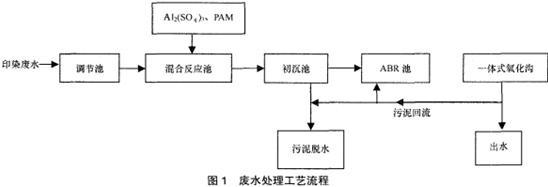 該印染廠所有車間生產廢水收集后匯入調節池,廢水經提升泵站進入混凝攪拌池,投入鋁鹽和PAM后進入初沉池,進一步去除懸浮物及部分COD。廢水再流入ABR反應池,廢水在該池水力停留時間約20h。經ABR厭氧處理后進入氧化溝進行好氧處理,處理出水進入二沉池進行泥水分離,上清液達標排放。沉淀池污泥吸至污泥回流槽,大部分由污泥回流至ABR池,其余作為剩余污泥泵至污泥濃縮池進行濃縮處理。