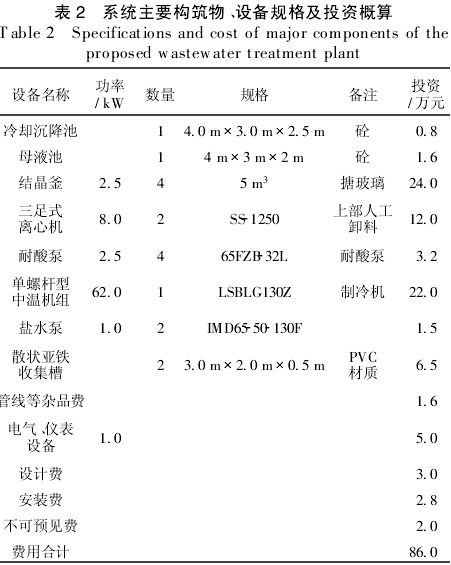 冷凍結晶法處理及回用鋼材酸洗廢水生產工藝系統的主要構筑物、設備規格及投資概算見表2。