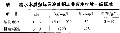 廢水水質指標及冷軋鋼工業廢水排放一級標準見表1。