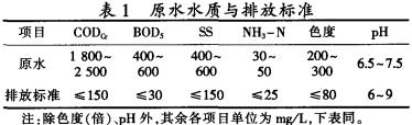 原水分為生產廢水和生活污水。生產廢水主要為油墨廢水和漿膠廢水,約占總水量的80%,其水質復雜,COD很高,但不含重金屬及有毒物質;生活污水約占總水量的20%,其污染較輕,且不含重金屬及有毒有害物質。兩種廢水綜合處理,有助于均化水質,利于生化處理。本工程設計出水水質要求達到國家環境保護總局頒布的《污水綜合排放標準》(GB8978-1996)中的二級排放標準.其原水水質與排放標準見表1。