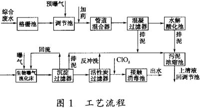 按照王朝包裝印刷有限公司的要求,處理出水近期達標排放,遠期用于沖廁、綠化等用途,本工程設計時考慮到這些因素,確定采用混凝沉淀一生物接觸氧化組合工藝處理該公司所排廢水,工藝流程如圖1所示。