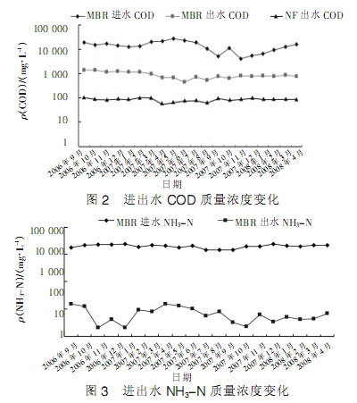 BR系統出水的COD質量濃度一直在1500mg/L以下,而運行后期出水則穩定在1000mg/L以下。整個運行期間MBR的平均出水COD質量濃度為945mg/L,平均COD去除率為94.6%。NF系統穩定運行后出水均能保持在100mg/L以下,均值為80mg/L,NF平均COD去除率達91.5%。系統總體COD去除率達99.5%。NH3-N的凈化主要通過MBR的生化凈化過程來實現,由于MBR能夠截留增殖緩慢的硝化細菌,大大提高了系統的硝化能力,MBR出水NH3-N質量濃度平均為6.9mg/L,已達到了排放標準。生化過程的NH3-N去除率高達99.5%。NF出水TN和TP質量濃度平均為57mg/L和0.5mg/L,達到了排放標準。