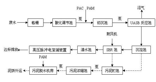 寧夏銀廣夏制藥廠污水站采用物化、厭氧UASB,好氧SBR和高壓脈沖電絮凝工藝。日處理能力720m3,工程總造價為795.41萬元,經過處理后,廢水達到了(GB8978-1996)二級排放標準。
