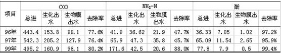 由表二可知,“老三套”改擴建后,COD去除率達76%,NH3-N去除率達46%,酚去除率達96%。96年出水綜合合格率為89.6%,97年出水綜合合格率為90.09%,99年出水綜合合格率為94.84%。出水綜合合格率逐漸提高。具體分析如下: