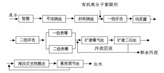 九江石化總廠煉油廠是以石油煉制為主的燃料型企業,原擁有加工原油能力250萬噸/年,煉油廢水采用“老三套”(隔油 浮選 表曝)法處理,設計處理能力500t/h。隨著加工原油品種的變化,廢水中的硫、酚含量高,同時對出水NH3-N的要求提高,老三套的弊端逐漸顯現出來,93年對老三套裝置進行改造,在老三套原有的基礎上增加一套淹沒式生物膜法。由于企業自身發展壯大,經擴建現擁有加工原油能力為500萬噸/年,同時隨著7萬噸/年的聚丙烯、MTBE、芳烴抽提、Ⅱ套16萬噸/年的氣體分餾裝置的相繼開車,使得來水水量增大,來水水質復雜波動大,為減輕生物膜的負荷沖擊, 98年擴建一套曝氣池和二沉池,。99年3月該流程投入使用,出水水質符合GB8978-96標準。
