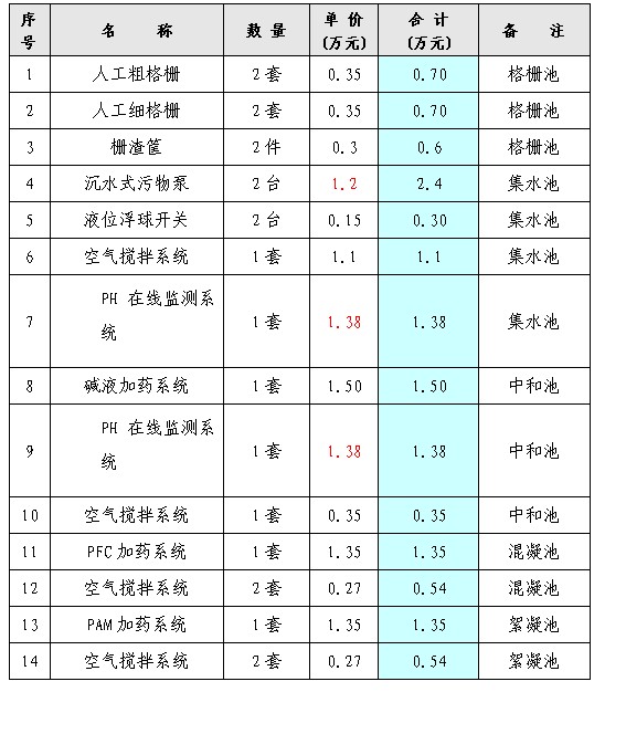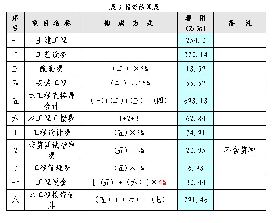 本方案土建投資、設備投資、總投資估算表分別見表1、表2、表3。