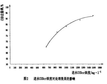 原水的CODcr變化幅度較大,最高值在3446mg/1,最小值是839mg/1。說明該處理工藝耐沖擊負荷能力強,即對進水水質急劇變化引起的沖擊負荷的適應能力強。CODcr的去除率在一定范圍內會隨進水CODcr濃度的提高而增長,如圖2所示。然而濃度過高,超過微生物的耐受能力時,將導致處理效果的降低。