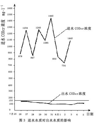 調試運行完畢,CODcr濃度的變化對本工藝出水水質的影響甚微,無論進水的CODcr突然升高或降低,出水的CODcr值變化不大,能保證出水CODcr值在100mg/1左右,低于國標要求的150mg/1。如圖3所示。