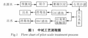中試裝置包括預處理、常規處理和深度處理三部分。深度處理工藝總進水量為5m3/h, GAC 和BAC工藝各占2.5m3/h。其中預加氯采用水射器投加;GAC和BAC 炭濾池規格相同,池高為4.2m,平面尺寸為 510mm×510mm,采用ZJ-15型柱狀炭,碘值大于900mg/g,亞甲藍值大于150 mg/g,直徑1.5mm,炭層厚2m;后臭氧接觸塔總容積為0.42m3,設置2 級 接觸,第一柱容積 0.097m3,直徑Φ150mm,塔高6m,有效水深5.5m,第二柱容積0.35m3