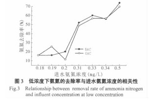 圖 3 低濃度下氨氮的去除率與進水氨氮濃度的相關性所降解,其后再加氯消毒, 降低了產生消毒副產物的危險。但從經濟角度等綜合考慮,建議優先采用GAC 工藝。