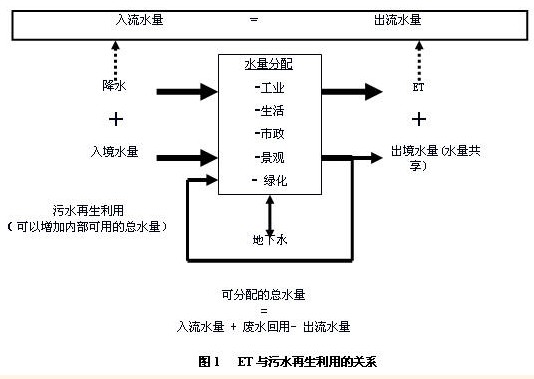廢污水作為水資源系統的一個組成部分,通過城市水資源的優化配置,為城市工業、河湖景觀、綠化以及農業灌溉等對水質要求較低的行業或部門提供了穩定的水源,在解決城市水資源供需緊張方面發揮了重要的作用,一直以來被認為是城市節水的主要措施之一。然而,工業(火電、鋼鐵等)、河湖景觀、綠化以及農業灌溉等是ET產生較多部門和行業,污水再生利用的過程中不可避免的要產生大量的ET。在水資源總量不變的前提下,污水再生利用是通過加大水資源開發利用的程度,增加本地區水資源的消耗量,而提高了一個城市或一個地區的水資源的保證率,并非真實意義的節水,如圖1所示。