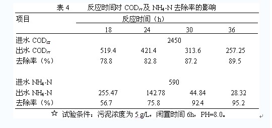 表4結果表明,在污泥濃度為5 g/L,閑置時間6h,PH=8.0的條件下,最佳反應時間為36h,CODcr去除率為89.5%,NH4-N去除率為95.2%。
