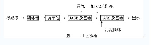 垃圾滲濾液經過細格柵后,除去滲濾液中的懸浮物及漂浮物,進入調節池,經泵提升至UASB上流式厭氧反應器進行厭氧發酵,產生的沼氣接至垃圾焚燒爐助燃,污泥脫水后填埋或焚燒,出水加CaO調堿度后自流進入CASS反應器。CASS是一種具有較好的脫氮除磷功能的循環間歇處理工藝,整個系統經歷進水期、反應期、沉淀期、排水期和待機期5個階段,而CASS反應器又分為三個區:一區為生物選擇器,二區為兼氧區,三區為好氧區。出水流經生物選擇器區,既可提高系統的穩定性,防止產生污泥膨漲,又可發生比較顯著的反硝化作用。出水自生物選擇器進入兼氧區和好氧區,該區主要完成降解有機物和硝化/反硝化過程。再經沉淀期后外排。