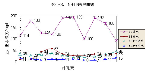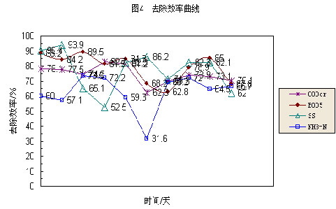由圖2、圖3、圖4可知:CODcr進水濃度范圍值為227~335mg/L,出水濃度范圍值為48~97mg/L,平均去除率為74.3%;BOD5進水濃度范圍值為85~133mg/L,出水濃度范圍值為11.2~29.3mg/L,平均去除率為79.1%;SS進水濃度范圍值為92~195mg/L,出水濃度范圍值為11~57mg/L,平均去除率為76.8%;NH3-N進水濃度范圍值為19~45mg/L,出水濃度范圍值為7~15mg/L,平均去除率為62.6%。