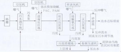 由于該制藥廢水的可生化性較差(BOD5/CODcr(<0.2),有機物濃度、懸浮物含量和色度均較大,并含有難生物降解的大分子有機物,水質成分復雜,因此,該廢水處理工藝的設計應先采用混凝反應沉淀預處理法去除廢水中大部分難生物降解的大分子有機物、懸浮物和色度,以減輕后續處理的負荷,并提高廢水的可生化性,再利用生物接觸氧化法有效地去除廢水中的有機污染物。廢水處理的工藝流程如下圖所示。
