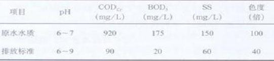 該公司生產廢水水量約為200m3/d,廢水處理系統設計運行時間為20h,設計處理水量為10m3/d。生產廢水的原水水質和相關排放標準見表1。