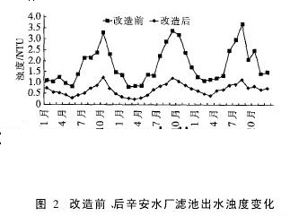 辛安水廠源水取自黃河最下游,污染較為嚴重。本次改造工程于2002年5月30日投入試運行,改造后與改造前對比表明:改造后的V型濾池達到無人操作,運行穩定,工作周期比原虹吸濾池大大延長,濾后水濁度<1 NTU(見圖2),出水水質明顯優于虹吸濾池。