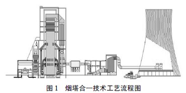 煙塔合一是將濕法脫硫后的煙氣送入自然通風冷卻塔與冷卻塔氣流一起排入大氣的煙氣排放技術。煙塔合一技術利用冷卻塔巨大的濕熱空氣上升氣流對脫硫后的凈煙氣形成包裹和抬升,從而促進煙氣中污染物的擴散。采用該技術可以省略火電廠濕法煙氣脫硫系統的再熱器和煙囪,大大簡化了火電廠的煙氣系統,減少了設備投資,因此具有很好的經濟性。