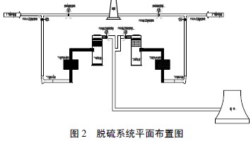 北京熱電廠采用4 臺鍋爐共用1 座冷卻塔進行煙氣排放,其中,1#、2#機組脫硫后煙氣通過1 根FRP 管道進入冷卻塔;3#、4#機組脫硫后煙氣通過另1 根FRP 管道進入冷卻塔,平面布置見圖2。為了節省文章篇幅,圖中未畫出 3#、4#機組脫硫系統。同時由于本工程是在機組相應預留位置安裝脫硫裝置,電廠煙囪在脫硫裝置運行初期予以保留。冷卻塔為加高型,其高度為120 m,進風口高6.5 m,冷卻塔底部直徑為70 m,喉部直徑為39 m,出口直徑為42 m,支柱對數為24對。