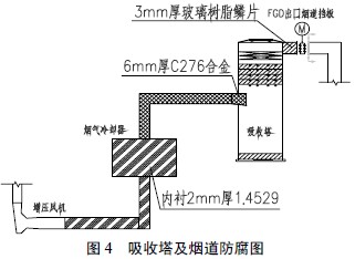 (1) 吸收塔及煙道防腐。吸收塔及煙道防腐如圖4所示,吸收塔殼體由碳鋼制作,噴淋層、漿液池內表面、吸收塔出口煙道采用3 mm厚玻璃鱗片樹脂內襯防腐,其余內表面采用2 mm厚玻璃鱗片樹脂內襯防腐。為了保證吸收塔長期安全可靠運行,有效防止煙氣溫度波動、事故狀況下高溫煙氣對吸收塔的影響,以及抗磨損要求,煙氣冷卻器至吸收塔煙氣進口煙道采用6 mm厚C276合金,增壓風機至吸收塔入口之間的煙道、煙氣冷卻器外科采用2 mm厚1.4529不銹鋼內襯防腐。吸收塔出口煙道擋板后采用玻璃鋼煙道,不做防腐處理。