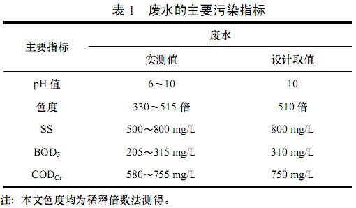 廣東某印染廠是一家主營牛仔洗漂和牛仔紗線漿染企業,該廠每天排放約4000 m3高色度、高懸浮物含量的服裝洗漂、染色廢水, 這些廢水以前僅經簡單的物化處理, 出水不能達標,且污泥量大。為貫徹我國環境保護的方針,整治該地區的水污染,我公司承擔了該廠的廢水治理工作。 由于該廠地處二類水源保護區,故執行《廣州市污水排放標準》DB44 37-90一級新擴改標準:pH:6~9;色度:40倍;SS:70 mg/L;BOD5:30 mg/L;CODCr:80 mg/L。 表1為該廠廢水主要污染指標的實測數據。 由表1可知,BOD5/CODcr=0.17,廢水生化性欠佳。該廠使用大量靛藍、硫化黑及燒堿、滲透劑等多種印染助劑,是造成廢水生化性差的主要原因。