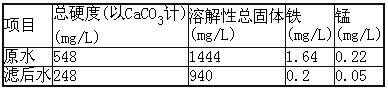 在裝有1L原水的燒杯內加入Ca(OH)2溶液后,用攪拌器攪拌。混合時攪拌1 min,轉速為 300 r/min。絮凝時間為15min,先攪拌5min,轉速為60r/min;然后再攪拌5min,轉速為40 r/min ;最后攪拌5min,轉速為20r/min。靜止沉淀30min,取上清液125mL,檢測鐵、錳、總硬度和總溶解性固體含量。測定結果見表2。從表2中可得出如下結論: