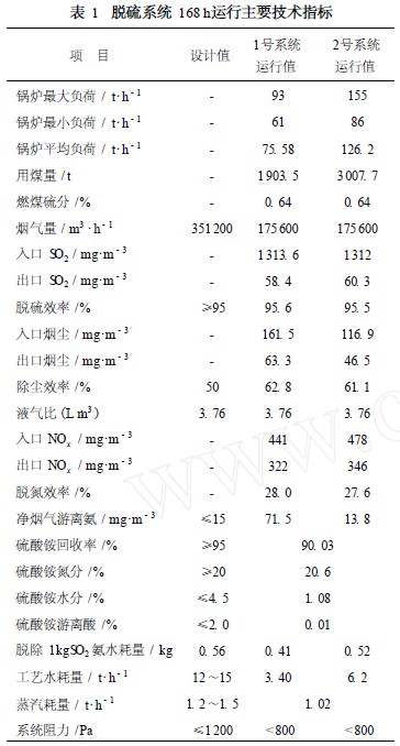 太倉保利協鑫熱電公司1 號、2 號脫硫系統 168 h運行的主要技術指標詳見表1。