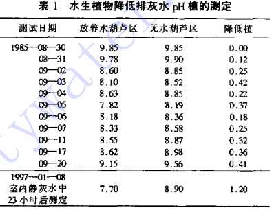 (2)在流動的排灰水或靜灰水中放植水葫蘆,均能降低pH植。其測試結果見表1。