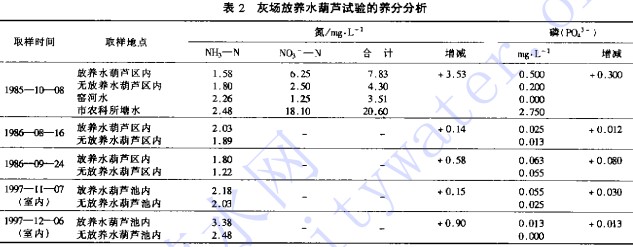 (3)使用著的貯灰場中放植水生植物,還能增加灰水中的氮、磷養分的含量。其測試結果見表2。據表2,1985年小區試驗中,放植水葫蘆的排灰水養分含量雖無市農科所塘水高,但比同灰場中無水葫蘆區及一壩之隔的窯河水高,其中總氮含量為7.83mg/L,較對照組未放植水生植物灰場(總氮4.32mg/L)增加了3.53mg/L;磷含量較對照區(0.20mg/L)增加了030mg/L。1986年在流速較大的閘門12,其放養水葫蘆的灰場排水養分含量也較無水葫蘆區咯有增加,其中氮增加0.曬~090mg/L,磷增加0012~0.080mg/L。這可能是因為水葫蘆不僅是營養成分較高的水生飼料,也是通過新陳代謝可釋放出養分的綠肥作物的緣故。
