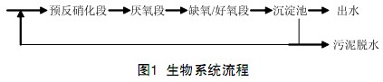 珠海市拱北污水處理廠始建于1985年,總占地面積15.8公頃,規劃總處理量為11萬噸/日,服務面積2200公頃,服務人口約22萬。主要處理拱北、前山片區內的城市污水。該廠建設分成三期工程完成,其中一期工程于1992年2月投入運行;二期工程于1998年4月投入運行;三期工程于2002年8月投入運行。一、二期工程的處理工藝相同,均為傳統活性污泥法工藝。由于能耗大,工藝落后,現已進行改造擴建。現在運行的是三期工程,全套工程引進意大利EMIT公司的技術,包括SCADA控制系統。三期工程的處理工藝采用AAO生物除磷脫氮工藝,鼓風曝氣,設計規模為8萬噸/日,占地8.3公頃。該工藝是改良的AAO工藝,與典型的AAO工藝所不同的是:構筑物在空間上沒有嚴格分開,且在生物池內缺氧與好氧(即硝化與反硝化)多重復一次,從而取代了AAO典型工藝中的內回流系統。其主要特點是生物系統,整個生物系統流程見圖1。