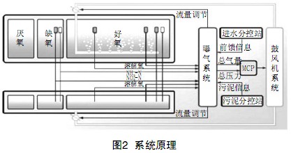 5)在污水處理的成本中,電耗是一大項,要有效地控制成本,如何節約電費是一個重要環節。拱北廠三期項目的用電成本占污水處理成本的50%左右,而生物池鼓風機的用電量占總用電量的60%左右。所以,鼓風機的曝氣控制對污水處理成本至關重要。設計曝氣系統時,引入了“前饋+后饋+模型”組合的多參數控制方式,可大大減少鼓風機的耗電量。其系統原理如圖2所示。