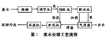 廢水的BOD5/CODcr為0.4左右,可生化性較好。傳統活性污泥法一般需設置二沉池、污泥回流設施,其用地及投資均比采用SBR法高。考慮到廢水水質的不均勻性和季節性水量差異較大、可用地面積小等因數,本工程選用工藝簡單、操作靈活的SBR工藝[2]。處理工藝流程見圖1。