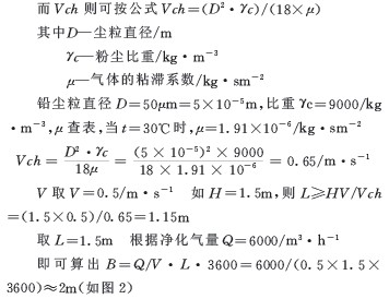 沉降室基本尺寸的確定,假定在整個沉降室內,一方面鉛塵以沉降速度Vch下降,另一方面隨煙氣以V速度前進,為了保證鉛塵有足夠的時間(T1)以Vch的沉降速度通過H高度(沉降高度)降落到沉降室底部,含塵煙氣以速度V經長度L的沉降室的時間(T2)必須大于(T1)于是