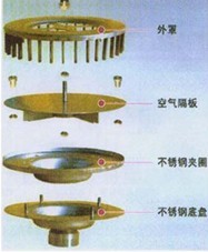 標準型的雨水斗,是由雨水斗底盤、夾圈、空氣隔板、格柵外罩蓋組成。另外根據需要可提供通用型的絕緣底座,固定件,法蘭片,焊接片,防火保護帽,微型加熱電圈等配件。雨水斗材質為HDPE、鑄鐵或不銹鋼。其各部分有不同的結構功能。雨水斗置屋面層中,上部蓋有進水格柵。降雨過程中,雨水通過格柵蓋側面進入雨水斗,當屋面匯水達到一定高度時,雨水斗內的反渦流裝置將阻擋空氣從外界進入同時消除渦流狀態,使雨水平穩地淹沒泄流進入排水管。