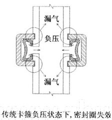 因此必須采用專門設計的抗負壓的溝槽管件,在正負壓不同狀態下,通過不同的密封點而保證系統的密封性。同時溝槽管件中管頭縫隙還可以消除因熱脹冷縮而產生的管道位移。如下圖所示: