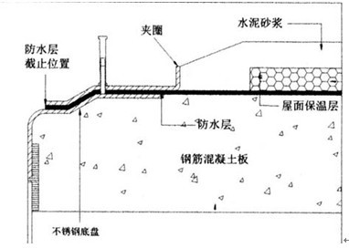 天溝雨水斗安裝:在屋面防水層施工前安裝不銹鋼底盤放在預留孔的正上方,確保底盤與面板頂面標高保持一致,同時用混凝土封堵尾管與預留洞之間的空隙。在混凝土封堵完成后,土建方開始進行防水施工,但要保證防水層不超過規定界限(如圖)。防水施工完成后,安裝夾圈,防水保護層及找平層做到夾圈的邊緣。在屋面工程結束,管路系統安裝完畢后安裝空氣擋板或隔柵防護罩。