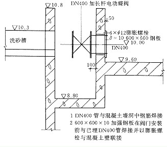 a.濾池進水 拆除原進水虹吸管,在進水渠側墻開設進水口,以DN400加長桿電 動蝶閥控制。電動頭的位置保證位于最高液位上并便于維修,見圖2。