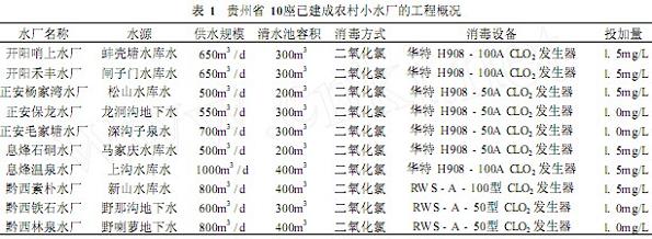 世界銀行貸款第四期中國農村供水與環境衛生項目在貴州省的修文、開陽、息烽、畢節、金沙、黔西、威寧、納雍、正安9個縣(市)共修建了88座農村水廠,解決568個村80.71萬農民的飲水解困和飲水安全問題。通過對其中4個縣已建成10座水廠的調研,所有水廠的消毒方式均采用了二氧化氯消毒。