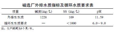 長鋼集團磁選廠存在噸鋼耗水量大和污水排放污染周邊環境的現狀。該廠生產規模為1.4萬t/a,新水耗量為31.2m3/h,循環水量為110m3/h,循環率為71.64%;生產運行制度為間斷運行,每天2班,每班8小時,年總計生產8個月;外排水量為50m3/h,生產期間每天外排8.5h。