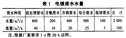 電鍍廢水的水質、水量與電鍍生產的工藝條件、生產負荷、操作原理、用水方式等因素有關,電鍍廢水水質復雜,成分不易控制;在設計時考慮將電鍍廢水分成五類進行處理,分別是:前處理廢水、含氰廢水、含鉻廢水、含多種金屬離子的綜合廢水、混排廢水。廢水水量見表1。