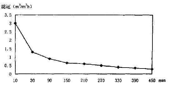 8h的過濾速度如圖1所示.在過濾的初期,濾速比較快,30min后濾速為1.3m3/m2h,90min后為0.9m3/m2h,270min后降至0.5m3/m2h,8h時約為0.2m3/m2h左右,但8h平均可達0.56m3/m2h.如能提高過濾液的溫度濾速還可以提高.