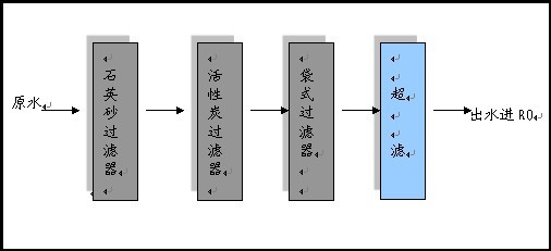 由于電鍍廢水水質復雜、成分不易控制、重金屬毒性大等特點,該電鍍廢水直接進入超濾系統會影響膜件的產水效率甚至直接損壞內部膜絲。因此,超濾前面須設置預處理工藝。針對本項目COD、BOD、懸浮物濃度較高的特點,預處理采用石英砂過濾器+活性炭過濾器+袋式過濾器的工藝,使水質達到超濾的進水要求。