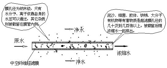 2.2.1原理:超濾膜是利用納米級的物理孔徑在一定的壓力作用下,對料液中的物質進行分離、凈化、純化和濃縮的一個純物理過程,它不引起分離物質化學性質的變化,是一種非常安全和可靠的過濾和濃縮方法。超濾的作用非常廣泛,它可以去除懸浮物、膠體、色度、濁度、有機物、細菌和大腸桿菌等雜質。其原理圖如下