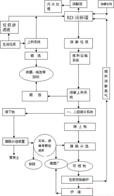 RD法是采用消解技術對垃圾進行工業化處理,垃圾不需要堆放脫水,直接將垃圾用輸送設備送入RD反應設備中,向RD反應設備中通入一定溫度和壓力的飽和蒸汽和催化劑,通過90分鐘的特定溫度、壓力、催化反應(此過程完成對垃圾的消化降解、滅菌、脫水、脫臭、減容等),排出垃圾脫水產生的反應液,然后降低壓力將處理后垃圾噴放到卸料車間。噴放過程對物料具備有輸送、閃蒸干燥、膨化、混合、粉碎、分離的作用。在消解反應過程中,只是垃圾成分中廚余部分和易腐有機物發生消解反應,保持反應過程PH在7-8之間,對金屬、電池不發生反應。垃圾由卸料車間將其連續輸送到成品車間進行篩分,經過篩分形成(1)可燃物燃料,(2)R型營養土,(3)金屬類,(4)玻璃、磚瓦類。