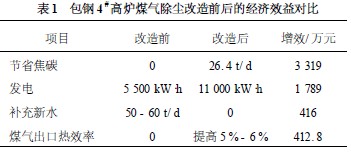 包鋼4 # 高爐實施全干式煤氣布袋除塵改造后,產生了良好的經濟和社會效益,從近期的運行情況看,該系統值得肯定的是余壓發電的能力提升,水資源節約,煤氣含塵量降低,與濕法除塵相比煤氣溫度可大幅度提高等。包鋼4 # 高爐實施煤氣除塵改造后按日產鐵4 400 t 計算比較濕法除塵可獲得的經濟效益如表1。