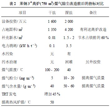 萊鋼3 # 高爐(750 m3) 全干式煤氣布袋除塵已順利運行近4 年,相比較濕法除塵各項指標效果明顯。表2 為萊鋼 3 # 高爐煤氣除塵改造前后的指標對比。