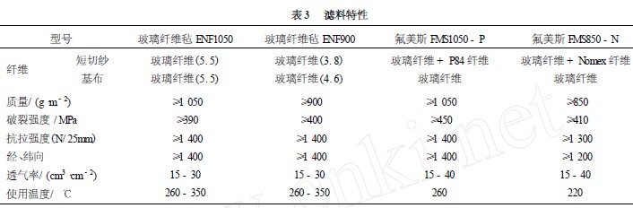 該系統工藝過程為高爐煤氣在符合運行條件下進入干式除塵,經濾袋過濾產生凈煤氣后通過調壓閥組或TRT發電后進入煤氣管網供用戶使用。在此系統中采用的濾料主要是玻璃纖維針刺氈或氟美斯針刺氈,它以5. 5μm 的玻璃纖維為主體,配以一定量的高溫纖維(P84 ,美塔斯,PPS) 制成, 具有三維微孔結構,運行阻力低,特別是P84 纖維截面呈不規則葉片狀,纖維表面積增加了80 %左右,因此具有較強的阻塵與捕塵能力。其主要特性如表3。
