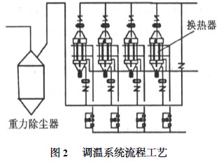 干法除塵所選用的濾袋能承受的最高溫度大概為 280 ℃左右,而進入濾袋除塵器的煤氣溫度下限應高于露點 30 ℃,因此,為防止溫度超高燒損濾袋或因溫度低而粘結濾袋,有效地控制進入箱體的煤氣溫度對布袋除塵器的正常運行是極為重要的。大中型高爐在操作中正常煤氣溫度在120 - 210 ℃之間,如出現爐況不順時煤氣溫度偏高的情況多于偏低的情況,目前國內通常采用調溫系統來控制煤氣溫度以利除塵系統的運行,其工藝流程如圖2。