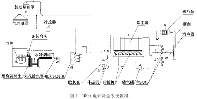 天津鋼管第二煉鋼廠節能環保改造100 t電爐項目采用意大利tenova 電爐技術,由意大利tenevol 提供電爐煙氣基本信息,中鋼設計院負責煉鋼工藝設計,中國京冶工程技術有限公司完成整個電爐的除塵系統設計。電爐除塵系統包括電爐一次、二次煙氣處置,采用了電爐爐蓋第四孔彎管脫開式直排與屋頂煙罩相結合的除塵工藝[1]。電爐第四孔捕集一次煙氣,煙氣捕集效率高,并減輕了電極把持器等設備的燒烤。而熔煉時從電極孔、加料孔和爐門等不嚴密處外逸于爐外的二次煙氣以及電爐在加料、出鋼、兌鐵水時產生的二次煙氣因其具有的突發性、排放無組織性、易受干擾性,只能憑借屋頂排煙罩來解決。一次、二次煙氣在除塵器前混合降溫,經除塵器凈化處理后由主風機經煙囪排入大氣。該項目自2009 年5 月投產以來,運行正常,廠房內換風及時,除塵效果好,達到預定的設計技術要求。由于電爐除塵工藝已是一種比較成熟的技術,本文著重分析100 t電爐除塵系統在設計、施工、運行中值得注意的關鍵技術。
